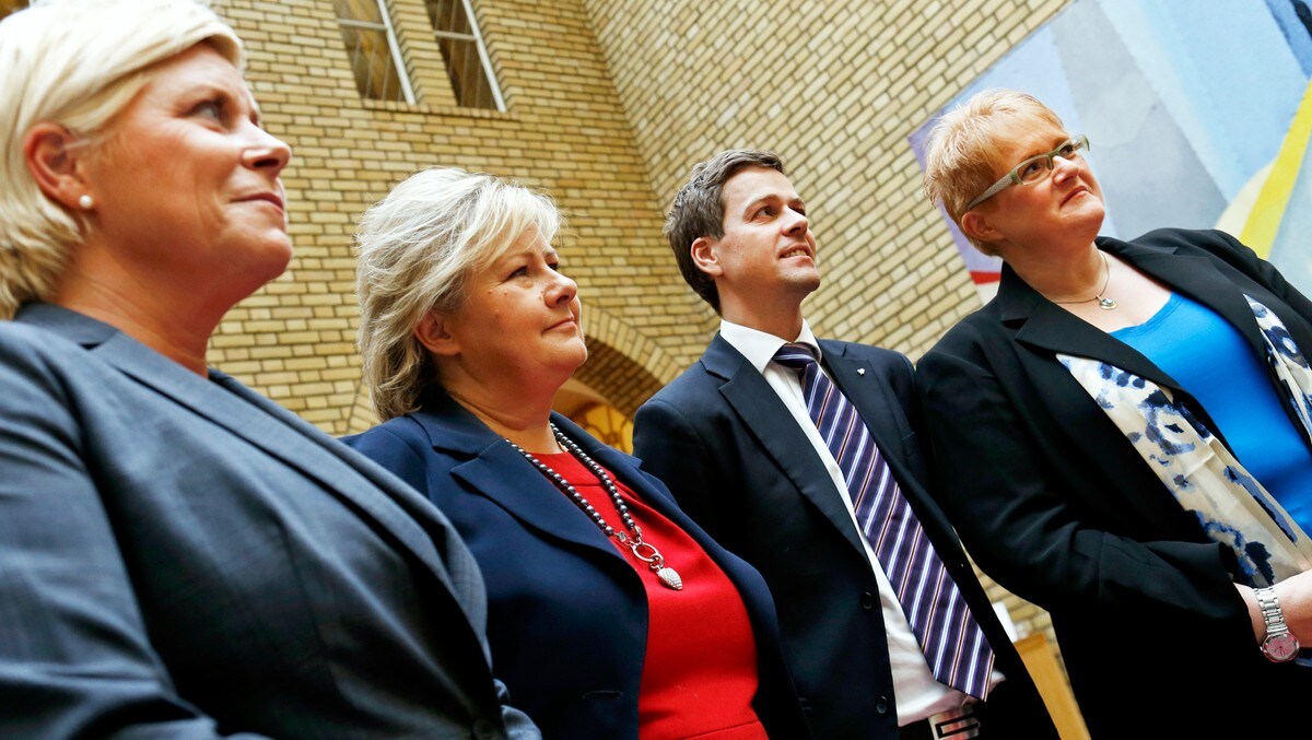 | Disse 4 partilederne blir sentrale i de politiske drøftinger de neste ukene. Fra venstre Siv Jensen (FRP), Erna Solberg (Høyre), Knut Arild Hareide (KRF) og Trine Skei Grande (Venstre) |